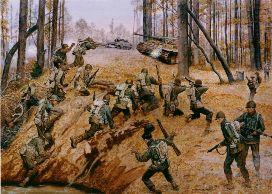 Painting depicting the 442nd Regimental Combat Team fighting in the Vosges Mountains in France.