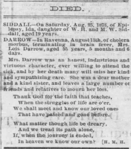 “Died.,” Democratic Press (Ravenna, Ohio), 28 August1873, p. 2; Newspapers.com (https://www.newspapers.com/: accessed 27 January 2026).
