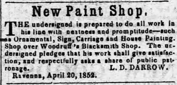 Check out my ancestor, Lorenzo D. Darrow, who opened a paint shop in Ravenna, Ohio, and posted an ad for his business in the local newspaper. He later suffered property loss in a fire, which also made local news.